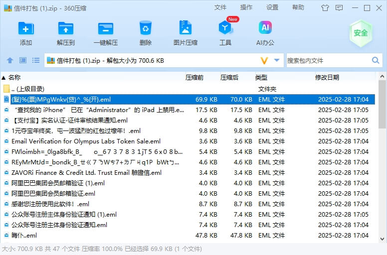 所查询出来的邮件默认打包压缩包,电脑打开解压即可阅读。